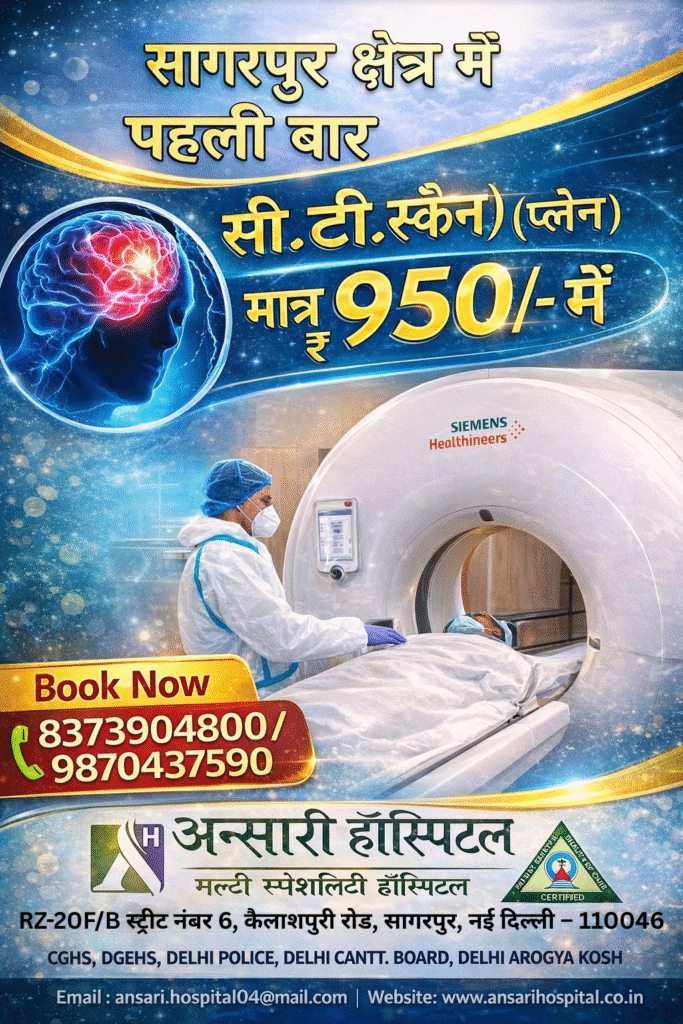 For the first time in the Sagarpur area, Ansari Hospital is providing CT Scan (Plain) at just ₹950, making high-quality diagnostics affordable for all.